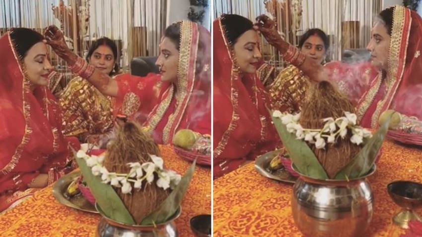 अक्षरा एक नई नवेली दुल्हन की तरह सजी हैं। उन्होंने सिंदूर भी लगाया है। -