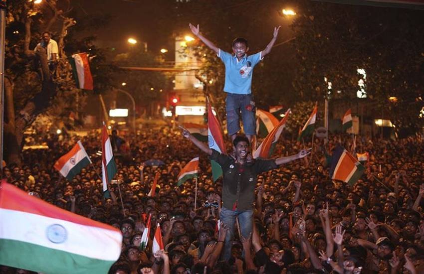 मरीन ड्राइव पर ICC क्रिकेट विश्व कप की जीत का जश्न मनाते लोग। (Express Photo by Mahendra Parikh)
