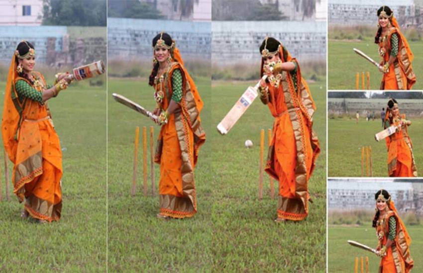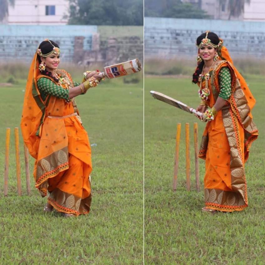 साड़ी, गहने और बल्ले का ये कॉम्बिनेशन सोशल मीडिया य़ूजर्स को खूब लुभा रहा है।