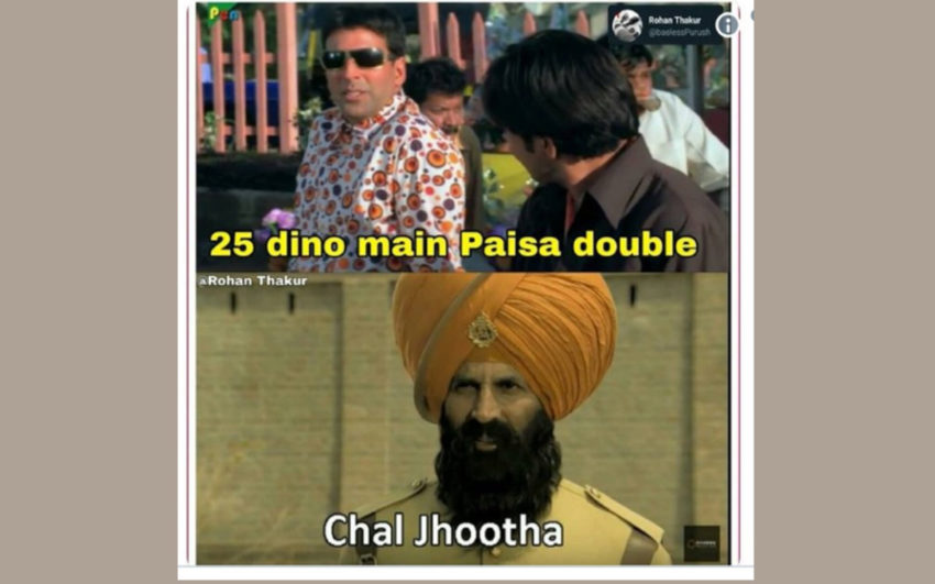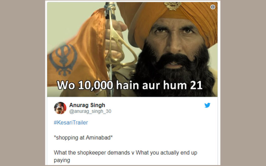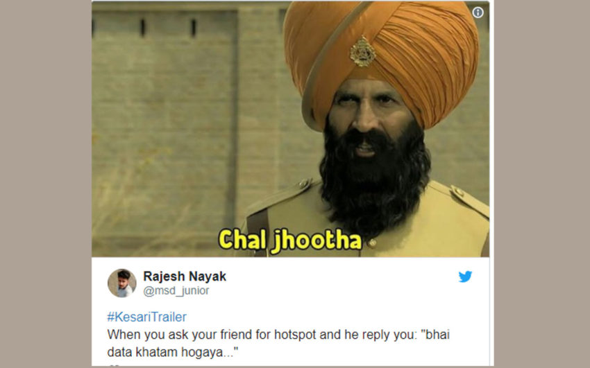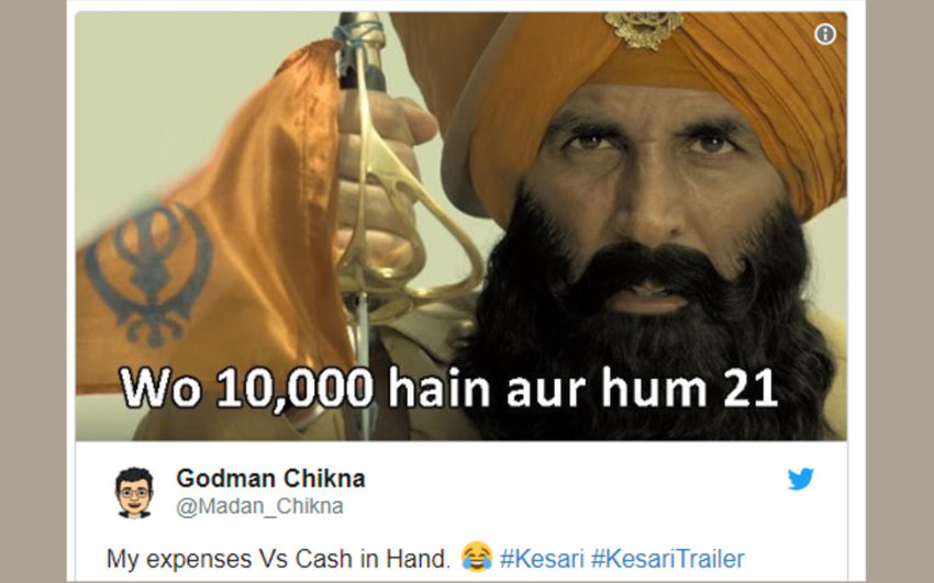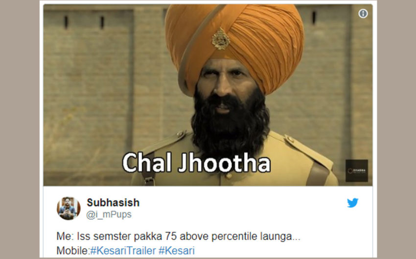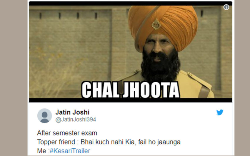 सारागढ़ी के युद्ध पर आधारित फिल्म केसरी का ट्रेलर रिलीज हो चुका है। इस फिल्म में अक्षय कुमार हवलदार ईशर सिंह का किरदार निभा रहे हैं। बता दें कि सारागढ़ी का युद्धा 1897 में लड़ा गया था और ईशर सिंह सिख रेजिमेंट के कमांडर थे। इस युद्ध में 36 सिख रेजिमेंट के 21 जवानों ने 10 हजार अफगान सैनिकों को धूल चटा दी थी। फिल्म के ट्रेलर को ऑडियंस से काफी शानदार रिएक्शन मिल रहे हैं। वहीं, ट्रेलर में अक्षय कुमार के एक डायलॉग ‘चल झूठा’ के मीम्स भी सोशल मीडिया पर जमकर वायरल हो रहे हैं। आइए देखते हैं कुछ फनी मीम्स…