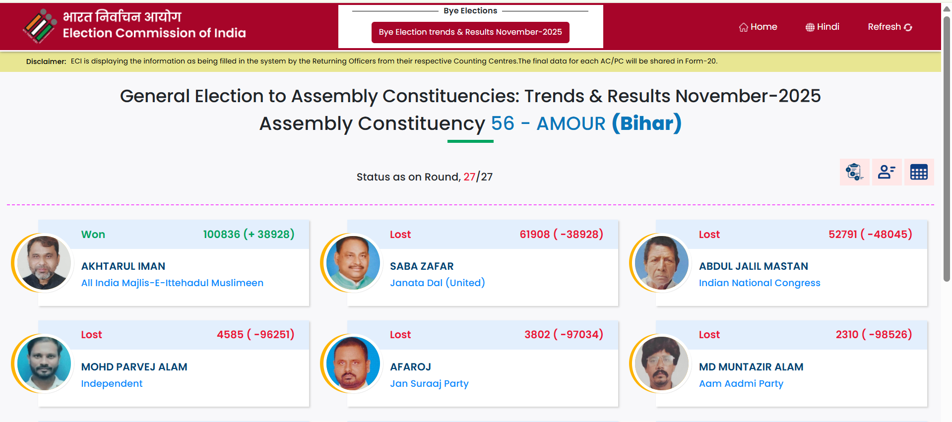 अखतरुल ईमान को कुल 100836 वोट मिले हैं, जबकि सबा जफर को 61908 वोट मिले हैं। वहीं, इस सीट पर कांग्रेस के अब्दुल जलील मस्तान तीसरे नंबर पर रहे। इस सीट पर जन सुराज पार्टी के अफरोज 3802 वोटों के साथ पांचवें नंबर पर रहे। वहीं, इस सीट पर चार ऐसे भी उम्मीदवार हैं, जिन्हें नोटा के बराबर भी वोट नहीं मिले हैं।