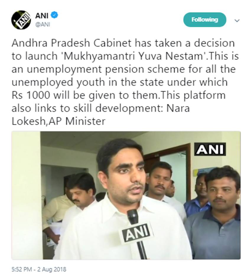 उन्होंने बताया, “आंध्र प्रदेश की कैबिनेट ने बड़ा फैसला लिया है। कहा है कि वह ‘मुख्यमंत्री युवा नेस्तम’ को लेकर आएगी। इस योजना के तहत राज्य के युवकों (जिनके पास नौकरी नहीं है) को बेरोजगारी पेंशन दी जाएगी। युवाओं को इसके अंतर्गत एक हजार रुपए दिए जाएंगे। साथ ही यह प्लैटफॉर्म कौशल विकास से भी जुड़ा रहेगा।”
