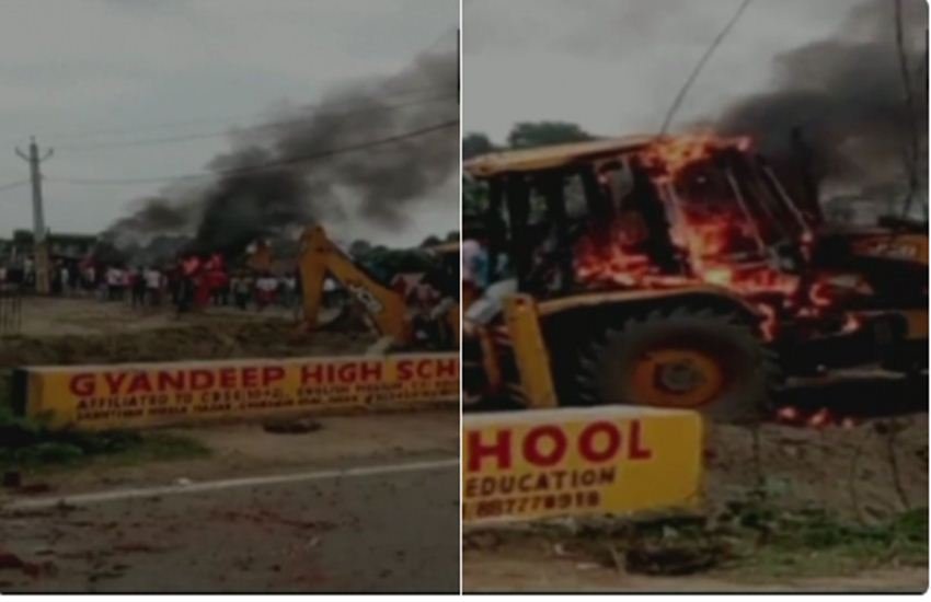 वहां हजारों की संख्या में मौजूद लोगों ने जेसीबी मशीन को क्षतिग्रस्त कर आग के हवाले कर दिया और जमकर पथराव किया। लोगों ने महिलाओं को आगे कर दिया जिससे पुलिस भीड़ को संभाल नहीं सकी और उसे भीड़ के आक्रोश का सामना करना पड़ा। पथराव में छह पुलिसकर्मी घायल हो गए। लोगों ने एक पुलिस जीप, तीन जेसीबी मशीन सहित कई वाहनों में आग लगा दी। पुलिस को भी बचाव में कई राउंड हवा में गोलियां चलानी पड़ीं। लोगों के बढ़ते आक्रोश के कारण पुलिस को वहां से हटना पड़ा।