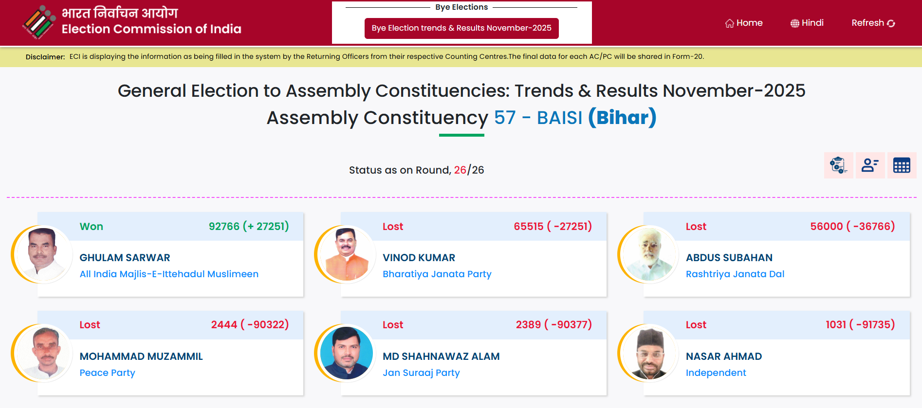 Baisi Election Result 2025: बायसी विधानसभा सीट पर AIMIM ने दूसरी बार जीत दर्ज की है। इस सीट पर गुलाम सरवर ने भाजपा के विनोद कुमार को 27251 वोटों के अंतर से हरा दिया है। गुलाम सरवर को कुल 92766 वोट मिले। वहीं, विनोद कुमार को 65515 वोट मिले। इस सीट पर राजद तीसरे नंबर पर रही। राजद के उम्मीदवार अब्दुस सुब्हान को कुल 56000 वोट मिले हैं।