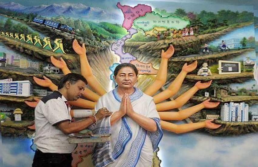 पश्चिम बंगाल, बिहार, झारखण्ड जैसे राज्यों में दुर्गा पूजा मनाने की तैयारियां जोर-शोर से चल रही हैं। पंडालों में मां दुर्गा की प्रतिमाएं सजाई जा रही हैं, मगर एक प्रतिमा को लेकर विवाद की स्थिति बनने लगी है। नादिया जिले के कल्याणी उपखंड में स्थित चकदाह शहर में लगे एक पंडाल में मां दुर्गा की जगह मुख्यमंत्री ममता बनर्जी की मूर्ति लगाई गई है। इसमें ममता अपनी चिर-परिचित नीले बॉर्डर वाली सफेद साड़ी में नजर आ रही हैं। उनके हाथ नमस्ते की मुद्रा में हैं। फाइबरग्लास से बनी ममता की इस प्रतिमा में 10 हाथ अलग से जोड़े गए हैं, जो बतौर मुख्यमंत्री उनके द्वारा लागू की गई सरकारी योजनाओं की तरफ इशारा करते हैं। सोशल मीडिया पर कई यूजर्स ने इसपर आपत्ति जताई है। गोपेश दुबे नाम के यूजर लिखते हैं, ”ममता को अब देवी माना जाने लगा है। वे लोग उनकी पूजा कर रहे हैं जिन्हें उनका आशीर्वाद चाहिए।” दुर्गा पूजा बंगाल का सबसे बड़ा त्योहार है। इस दौरान बंगाल में जगह-जगह मां दुर्गा की पूजा करने के लिए पंडाल लगाए जाते हैं। ममता बनर्जी की पार्टी तृणमूल कांग्रेस अप्रैल में हुए चुनावों में बहुमत हासिल कर दोबारा सत्ता में आई है। इससे पहले बंगाल से खबर आई थी कि एक गांव में बहुसंख्यक हिंदुओं को दुर्गा पूजा की इजाजत नहीं दी जा रही।