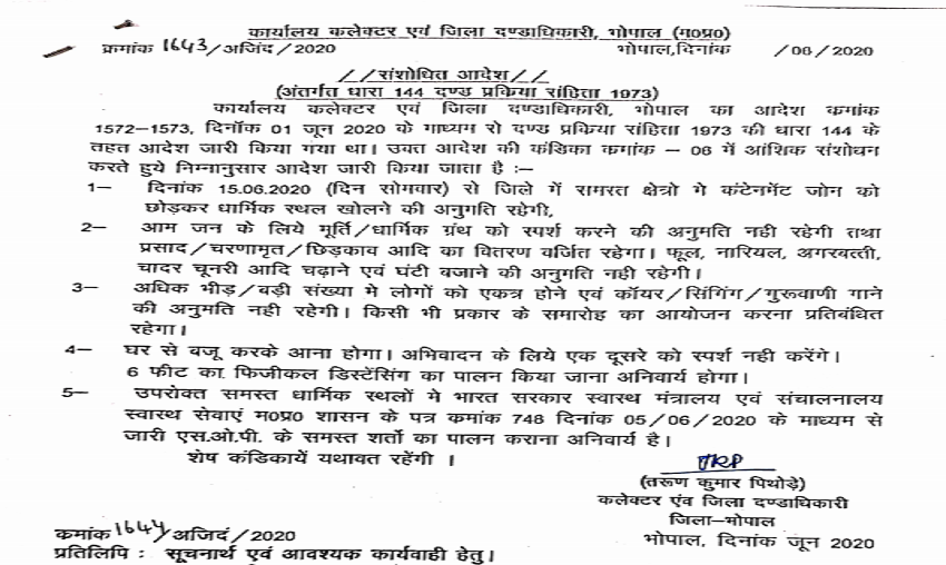 Bhopal Unlock 1 Full Guidelines in Hindi:  मध्य प्रदेश की राजधानी भोपाल में 15 जून, 2020 से सभी धर्मस्थल खुलेंगे। हालांकि, कंटेनमेंट जोन्स में मंदिर-मस्जिद और अन्य धार्मिक स्थल नहीं खुलेंगे। कलेक्टर और जिला दण्डाधिकारी के मुताबिक, श्रद्धालुओं को भगवान की मूर्तियां या फिर धार्मिक ग्रंथ को छूने की भी इजाजत नहीं होगी। यही नहीं, छह फुट की सामाजिक दूरी (सोशल डिस्टेंसिंग) का पालन करना भी सबके लिए अनिवार्य होगा।