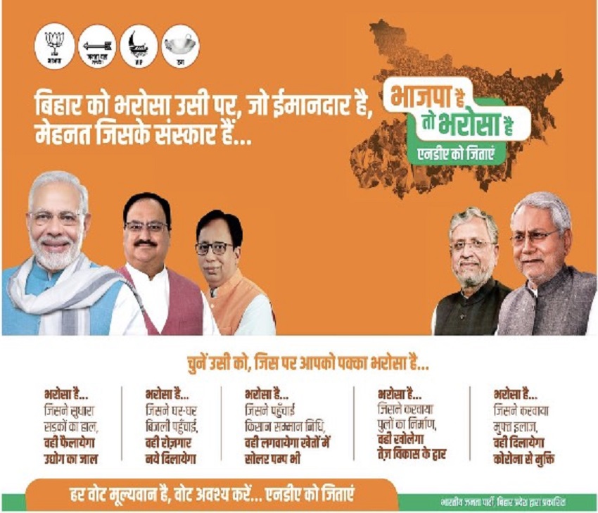 वहीं जेडीयू के विज्ञापन में नितीश और पीएम मोदी की तस्वीर लगी है। इस पोस्टर में लिखा है “सबसे बड़ा काम मतदान, बिहार को सक्षम और स्वावलंबी बनाने के लिए वोट जरूर करें।” इस विज्ञापन में पीएम मोदी और नीतीश कुमार बिहार के लोगों से मतदान करने की अपील कर रहे हैं। पोस्टर में नीचे लिखा हुआ है कि परखा है जिसको, चुनेंगे उसी को।