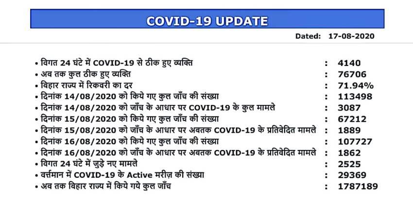 बिहार में पिछले 24 घंटे में कोरोना वायरस के 4140 मरीज ठीक हो चुके हैं जिसके बाद राज्य में कोरोना से ठीक होने वालों की संख्या बढ़कर 76706 हो गई है। राज्य में कोरोना से रिकवरी दर 71.94 प्रतिशत हो गई है। बिहार में अबतक 1787189 सैंपल्स की जांच की गई है। बिहार में कोरोना से संक्रमितों की संख्या बढ़कर 106618 हो गई है। वहीं, राज्य में कोरोना से मरने वालों की संख्या 542 हो गई है।