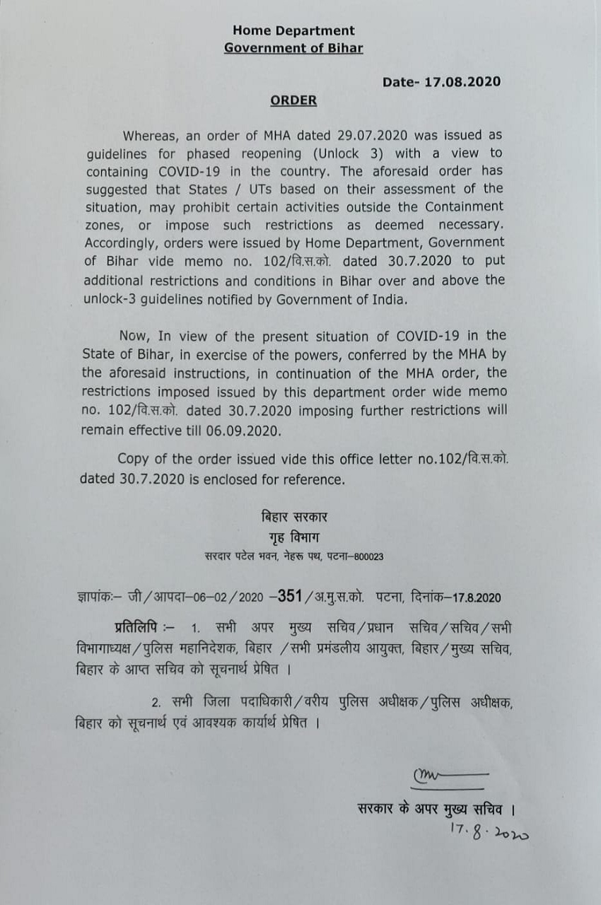 Bihar Lockdown Guidelines in Hindi: COVID-19 के मद्देनजर बिहार में छह सितंबर तक लॉकडाउन बढ़ा दिया गया है। यह ऐलान राज्य सरकार ने सोमवार को किया। राज्य के गृह विभाग के आदेश में कहा गया है कि बफर और कंटेनमेंट जोन्स में कड़ाई से नियमों का पालन कराया जाएगा।