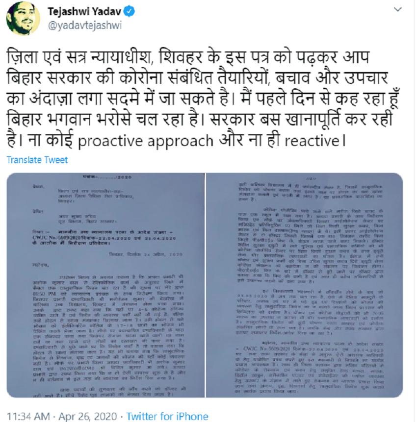 तेजस्वी के मुताबिक, “चारों ओर राशन वितरण में धांधली की खबर है। लाभार्थियों को गला-सड़ा अनाज बांटा जा रहा है। क़्वारांटाइन केंद्रों में कोई सुविधा नहीं, जाँच रिपोर्ट्स में लगातार गड़बड़ी उजागर हो रही है, सरकार द्वारा जारी आंकड़ों में स्थिरता और पारदर्शिता नहीं है।”