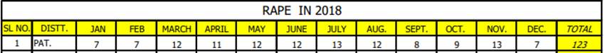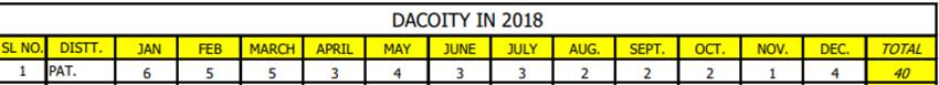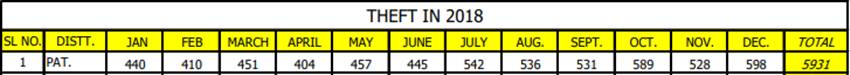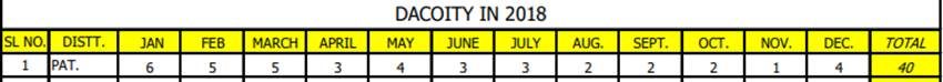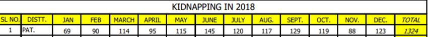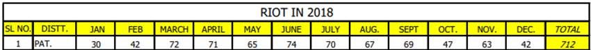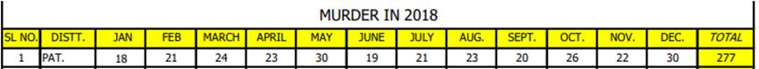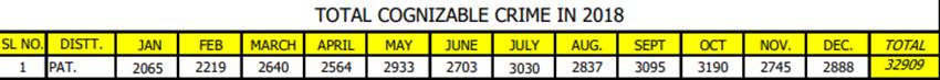 यदि पूरे बिहार में वर्ष 2018 के आपराधिक आंकड़ों की बात करें तो हत्या की कुल 2933, डकैती की 278, लूट की 1734, दंगे की 30915, रेप की 1475, अपहरण की 10310, फिरौती के लिए अपहरण की 46, रोड डकैती की 121, रोड पर लूट की 1464, बैंक डकैती की 5 और बैंक लूट की 4 घटनाएं दर्ज की गई।