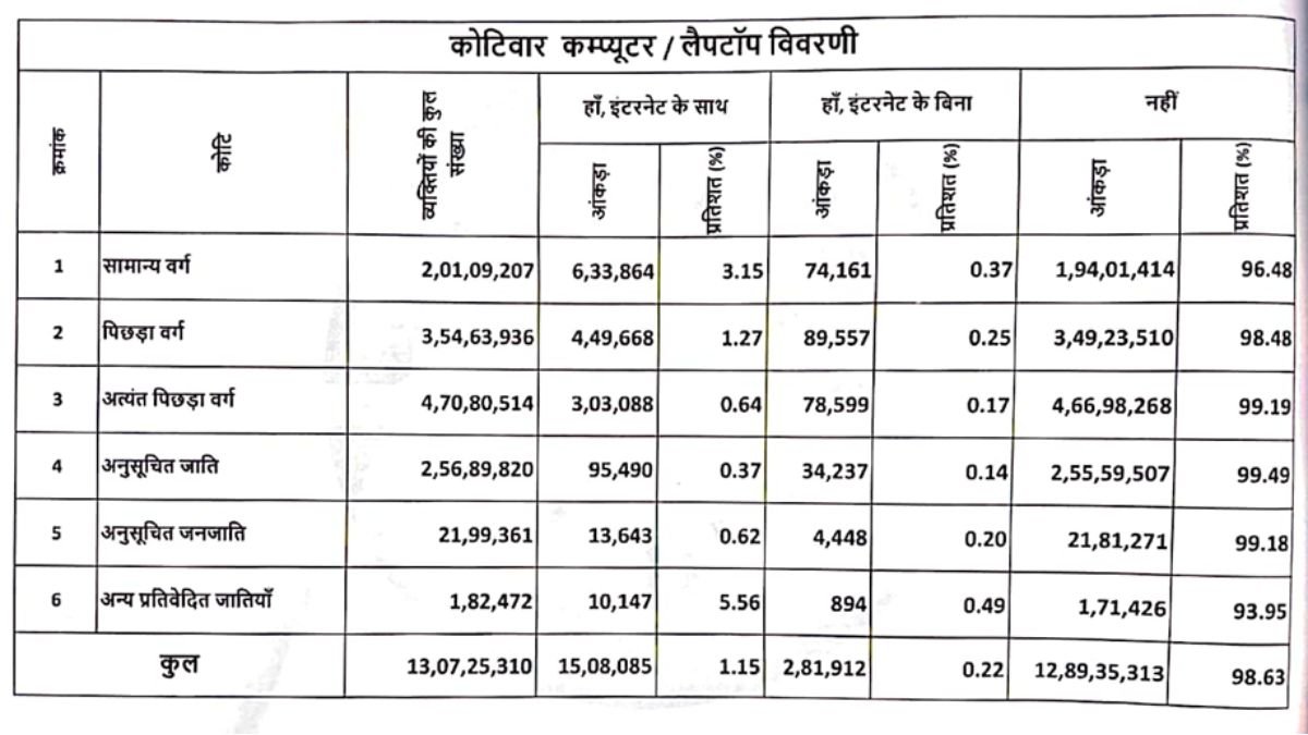 जाति के आधार पर कंप्यूटर की उपलब्धता की बात करें तो राज्य के सामान्य वर्ग के लगभग 3.15 लोगों के पास इंटरनेट कनेक्टेड कंप्यूटर की सुविधा है, जबकि बगैर इंटरनेट वाले सामन्य वर्ग के लोग 0.37 प्रतिशत है। पिछले वर्ग की बात करें तो 1.27 के पास इंटरनेट वाला कंप्यूटर है, जबकि 0.25 प्रतिशत पिछड़े वर्ग के लोग बिना इंटरनेट वाला कंप्यूटर या लैपटॉप यूज कर रहे हैं। अति पिछड़ा वर्ग की बात करें तो इंटरनेट के साथ लैपटॉप इस्तेमाल करने वाले लोगों की संख्या 0.64 प्रतिशत है। इसके अलावा बिना इंटरनेट वाले कंप्यूटर को यूज कर रहे लोगों की संख्या 0.17 है।