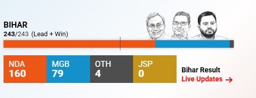 मीडिया रिपोर्ट्स के मुताबिक, एनडीए 85 सीटों पर, महागठबंधन 57 सीटों पर और अन्य 6 सीटों पर आगे चल रहे हैं। वहीं, चुनाव आयोग के आंकड़ों के मुताबिक, बीजेपी 5 सीटों पर आगे चल रही है।