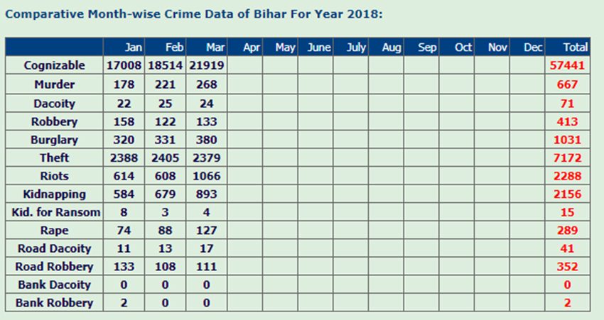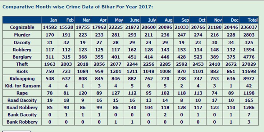 इसी तरह अगस्त 2017 में राज्य में कुल 236 मर्डर के मामले दर्ज हुए थे जो दिसंबर 2017 में 228 रह गए। एनडीए सरकार आते ही राज्य में रेप की वारदात में बढ़ोत्तरी हो गई। अगस्त 2017 में कुल 102 मामले, सितंबर में 118 मामले, अक्टूबर में 113 मामले रेप के दर्ज किए गए। हालांकि, नवंबर-दिसंबर में रेप के मामलों में कमी आई है। इसी तरह दंगों, किडनैपिंग, चोरी, छिनतई के मामलों में भी बढ़ोत्तरी हुई है।