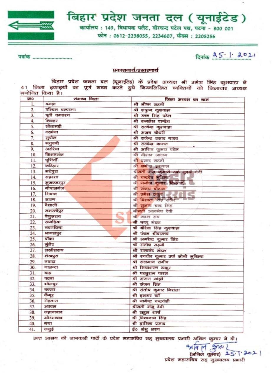 जारी सूची में भागलपुर ज़िले को दो भागों में बांटा गया है। भागलपुर और नवगछिया। पंचम श्रीवास्तव को भागलपुर का नया जिला अध्यक्ष नियुक्त किया गया है। वहीं वीरेंद्र सिंह कुशवाहा को नवगछिया का जिलाध्यक्ष बनाया गया है।