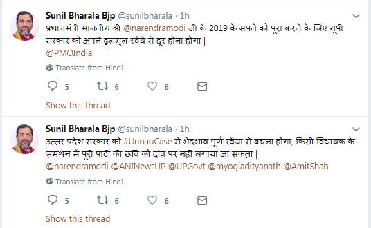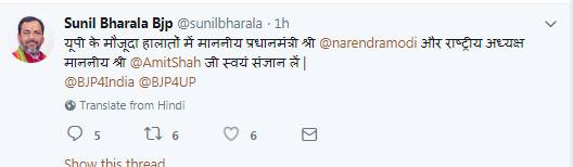 सुनील भराला ने ट्वीट कर लिखा है-मोदी जी के 2019 के सपने को पूरा करने के लिए यूपी सरकार को ढुलमुल रवैये से दूर रहना होगा । यूपी के मौजूदा हालातों में पीएम मोदी और अमित शाह जी स्वयं संज्ञान लें। फिर उन्होंने दूसरे ट्वीट में लिखा-एक विधायक के समर्थन में पूरी पार्टी को दांव पर नहीं लगाया जा सकता। यूपी सरकार को भेदभावपूर्ण रवैया से बचना होगा।ट्वीट को उन्होंने नरेंद्र मोदी और अमित शाह को भी टैग किया है।