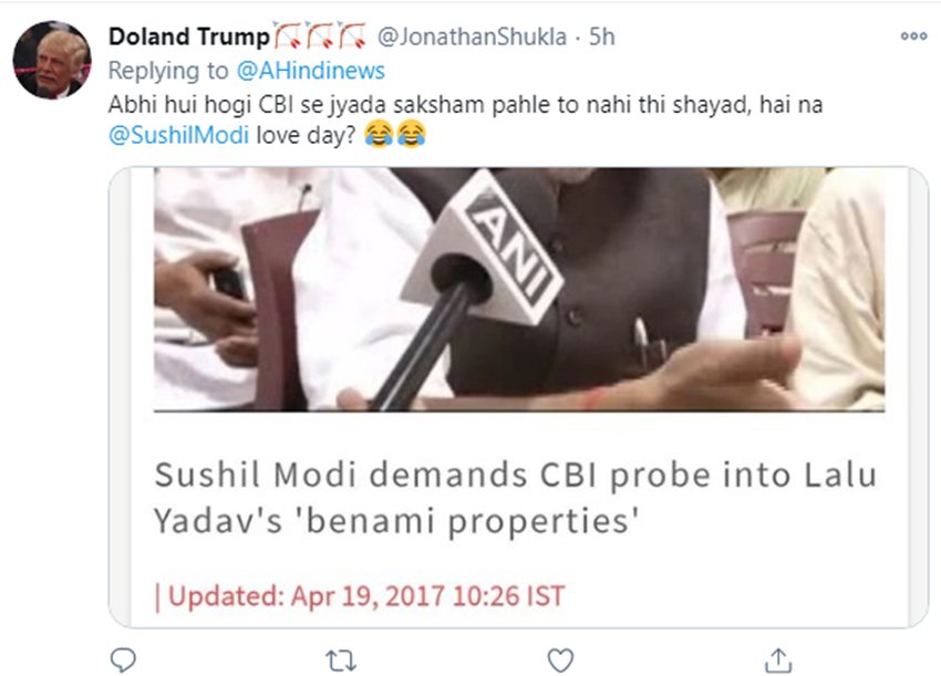 सुशील मोदी के इस बयान के बाद ट्विटर पर लोग उन्हें ट्रोल करने लगे। एक यूजर ने सुशील मोदी को राज्य के पूर्व सीएम लालू प्रसाद यादव पर लगे आरोपों की याद दिलाते हुए स्क्रीनशॉट शेयर किया जिसमें सुशील मोदी ने लालू प्रसाद की बेनामी संपत्ति को लेकर सीबीआई जांच की मांग की थी। यूजर ने लिखा कि ‘अभी हुई होगी सीबीआई से ज्यादा सक्षम पहले तो नहीं थी शायद, है ना @Sushilmodi’