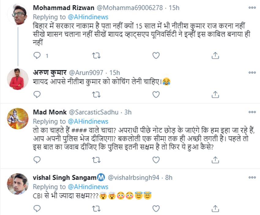 मोहम्मद रिजवान नाम के एक यूजर ने लिखा कि ‘बिहार में सरकार नाकाम है पता नहीं क्यों 15 साल में भी नीतीश कुमार राज करना नहीं सीखे शासन चलाना नहीं सीखें शायद व्हाट्सएप यूनिवर्सिटी ने इन्हीं इस काबिल बनाया ही नहीं।’ एक अन्य यूजर ने लिखा कि ‘शायद आपसे नीतीश कुमार को कोचिंग लेनी चाहिए।’