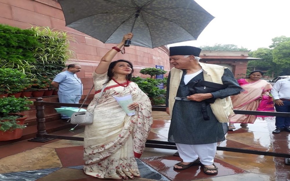 सावन शुरू होते ही बारिश ने देश की राजधानी को तरबतर कर दिया है। आसमां से गिरती बूंदें लोगों का मन मोह रही हैं। इसी रिमझिम के बीच संसद के गलियारों से एक तस्वीर सोशल मीडिया पर वायरल हो रही है। इस फोटो में बॉलीवुड की ड्रीम गर्ल व बीजेपी सांसद हेमा मालिनी और नेशनल कॉन्फ्रेंस के अध्यक्ष फारूक अब्दुल्ला एक साथ नजर आ रहे हैं। इस दौरान दोनों ही नेता बारिश से बचने के लिए एक ही छाते के नीचे दिखे। वहीं, इस खूबसूरत तस्वीर का जवाब फारूक के बेटे उमर अब्दुल्ला ने अलग ही अंदाज में दिया है।