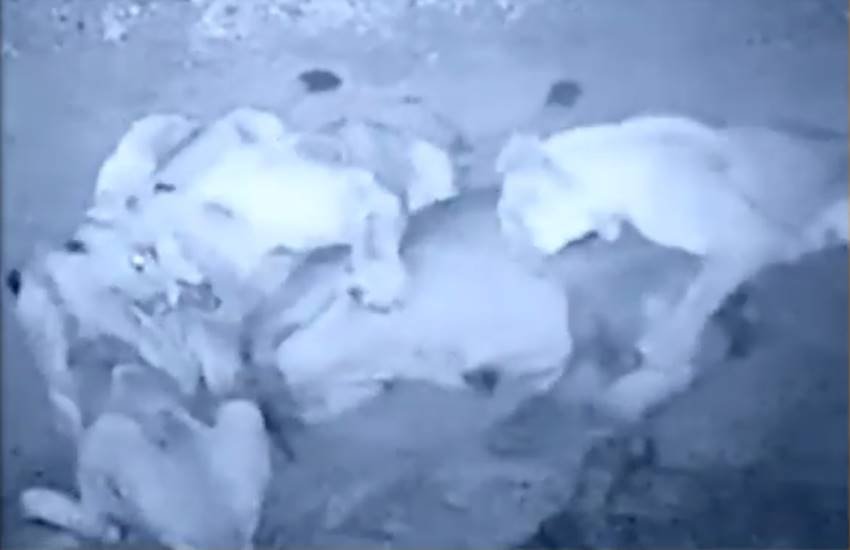 गुजरात के गिर अभयारण्य के कुछ शेर निकल कर पास के जूनागढ़ में पहुंच गए हैं। बता दें कि जूनागढ़ एक शहरी इलाका है जो कि गिर के जंगलों से काफी नजदीक है। बताया जा रहा है कि जंगल से निकले 4 शेरों ने एक गाय पर हमला बोल दिया। इस पूरे मामले का एक सीसीटीवी फुटेज भी सामने आया है। बताया जा रहा है कि चार शेर जूनागढ़ के गुजरात औद्योगिक विकास निगम में घुस आए। गुजरात औद्योगिक विकास निगम का ये क्षेत्र शहरी आबादी से बिल्कुल सटा हुआ है। मीडिया रिपोर्ट्स के मुताबिक सोमवार को 4 शेर इस इलाके में घुस आए थे। उन सबकी नजर वहां टहल रहे एक गाय पर पड़ी। देखते ही देखते ये चारों शेर उस गाय पर टूट पड़े। शेरों ने गाय को चारों ओर से घर कर उसपर हमला बोला। देखते ही देखते गाय वहीं सड़क पर धराशायी होकर गिर जाता है। गाय के गिरते ही चारों शेर उसपर अपने दांत गड़ा देते हैं। सीसीटीवी फुटेज में ये भी दिख रहा है कि थोड़ी ही देर में उस पूरी जगह पर खून पैल जाता है।