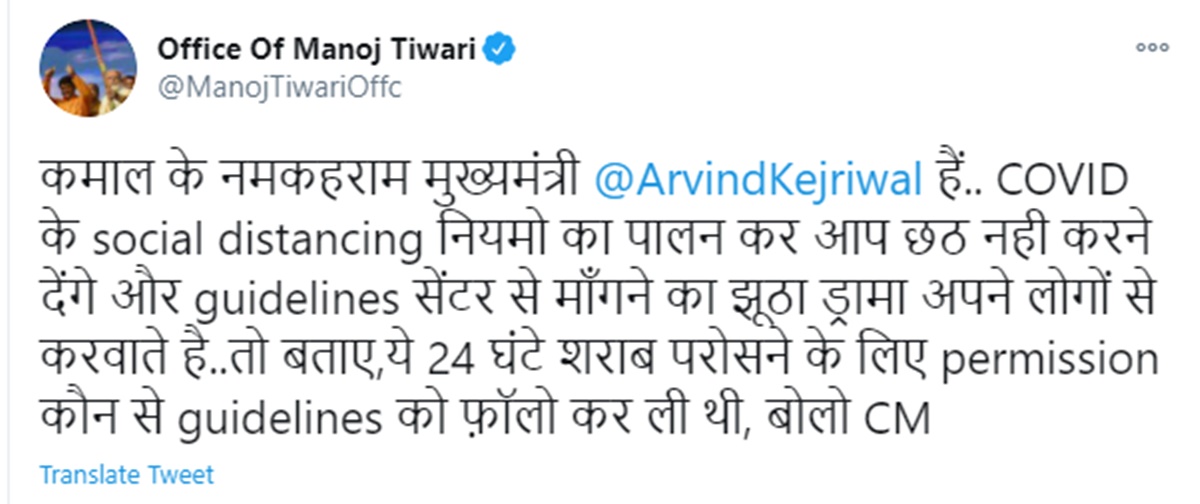 मनोज तिवारी ने 18 नवंबर को ट्वीट कर कहा, ‘कमाल के नमकहराम मुख्यमंत्री हैं अरविंद केजरीवाल। कोविड-19 के सोशल डिस्टेंसिंग नियमों का पालन कर आप छठ नहीं करने देंगे और दिशा-निर्देश केंद्र से मांगने का झूठा ड्रामा अपने लोगों से करवाते हैं। तो बताए, ये 24 घंटे शराब परोसने के लिए अनुमति कौन सी गाइडलाइन को फॉलो कर ली थी, बोलो सीएमी।’ तिवारी के ट्वीट पर आम आदमी पार्टी ने प्रतिक्रिया दी। उनके ट्वीट को रिट्वीट कर कहा गया कि मनोज तिवारी को शर्म आनी चाहिए।