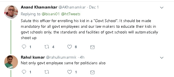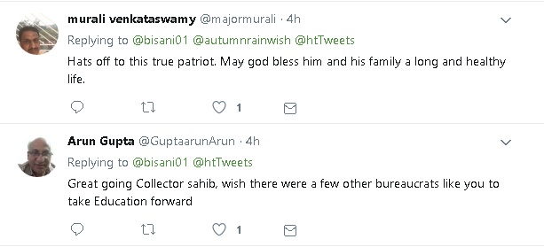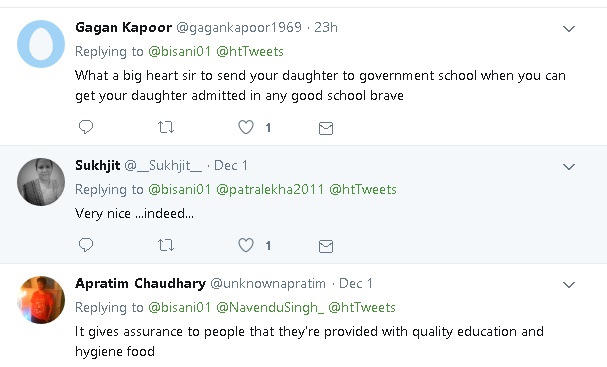 कलेक्टर साहब की इस तस्वीर पर उन्हें सोशल मीडिया पर काफी तारीफ मिल रही है। अरुण गुप्ता नाम के एक ट्विटर यूजर ने लिखा है, ‘बेहतरीन कलेक्टर साहब, गगन कपूर ने लिखा है, ‘ क्या दरियादिली दिखाई है साहब आपने अपनी बेटी को सरकारी स्कूल में भेजकर, शानदार।’ एक शख्स ने लिखा, ‘ऐसे ही लोगों की वजह से देश चल रहा है और इंसानियत जिंदा है।’ वीना राव ने लिखा, ‘जानदार खबर, आपको और शक्ति मिले, आपके तरह की लोगों में और भी इजाफा हो।’ एक यूजर ने लिखा, ‘जिस दिन नेताओं के बच्चे सरकारी स्कूल में पढ़ने जाएंगे उसी दिन से इन स्कूलों की हालत सुधर जाएगी।’ एक यूजर ने लिखा कि कलेक्टर साहब को दूसरे स्कूलों को भी इसी तरह बनाने पर ध्यान देना चाहिए।