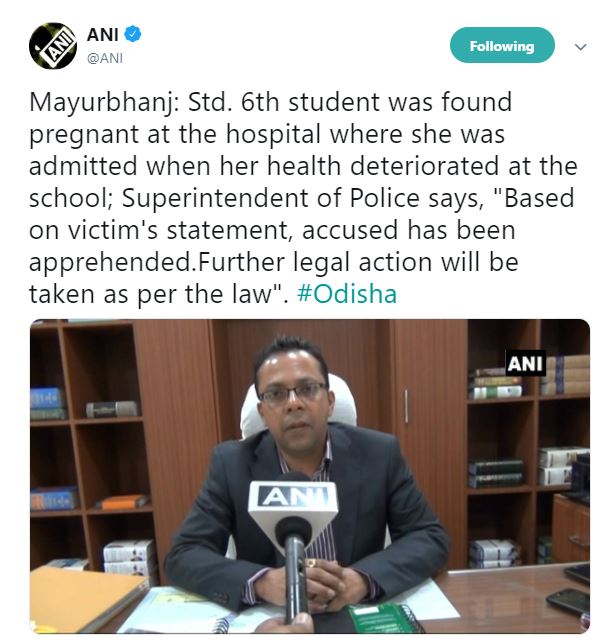 क्या है मामला: दरअसल पूरा मामला ओडिशा के मयूरभंज का है। जहां कक्षा 6 की एक छात्रा की तबीयत स्कूल में ही अचानक बिगड़ गई। जिसके बाद उसे स्कूल स्टाफ अस्पताल लेकर गया और परिजनों को जानकारी दी गई। अस्पताल में जांच के बाद पता लगा की छात्रा प्रेग्नेंट है और इस ही वजह से उसकी तबीयत बिगड़ गई है। ऐसे में स्कूल स्टाफ और परिजनों ने पुलिस को मामले की जानकारी दी। जिसके बाद मौके पर पहुंची पुलिस ने पीड़ित छात्रा का बयान लेकर आरोपी शख्स को गिरफ्तार कर लिया है।