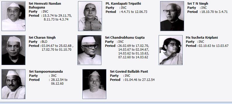 गोविंद बल्लभ पंत के बाद, 1954 से 1960 तक संपूर्णानंद मुख्यमंत्री रहे। 1960 से लेकर 1963 तक मुख्यमंत्री के पद पर पर चंद्रभानु गुप्ता रहे। 1963 में यह जिम्मेदारी कांग्रेस की सुचेता कृपलानी के कंधों पर आई। वह राज्य की पहली महिला मुख्यमंत्री बनीं और 1967 तक इस पद पर बनी रहीं थीं। इसके बाद 19 दिनों के लिए फिर यह जिम्मेदारी चंद्रभानु गुप्ता के कंधों पर आ गई। यहां चौधरी चरण की एंट्री हुई और वह 1967 से लेकर 1968 तक मुख्यमंत्री रहे। यह पहला मौका था जब राज्य की जिम्मेदारी नॉन कांग्रेसी के कंधों पर गई थी।