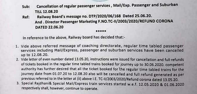 भारतीय रेल बोर्ड ने फैसला लिया है कि वह रेग्युलर टाइम टेबव वाली यात्री सेवाओं को 12 अगस्त 2020 तक के लिए रद्द रखेगा। इन यात्री ट्रेन सेवाओं में Mail/Express, Passenger and Suburban Services शामिल हैं।