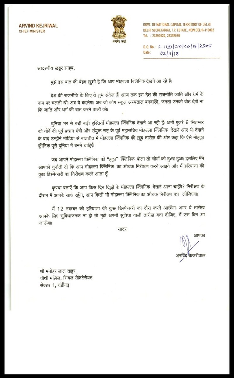 केजरीवाल ने लिखा, “जब आपने मोहल्ला क्लीनिक को ‘हल्ला क्लीनिक’ बोला तो लोगों को दुख हुआ, इसलिए मैंने आपको चुनौती दी कि आप मोहल्ला क्लीनिकों का औचक निरीक्षण करने आइए और मैं भी हरियाणा की कुछ डिस्पेंसरियों का निरीक्षण करने आता हूं।”