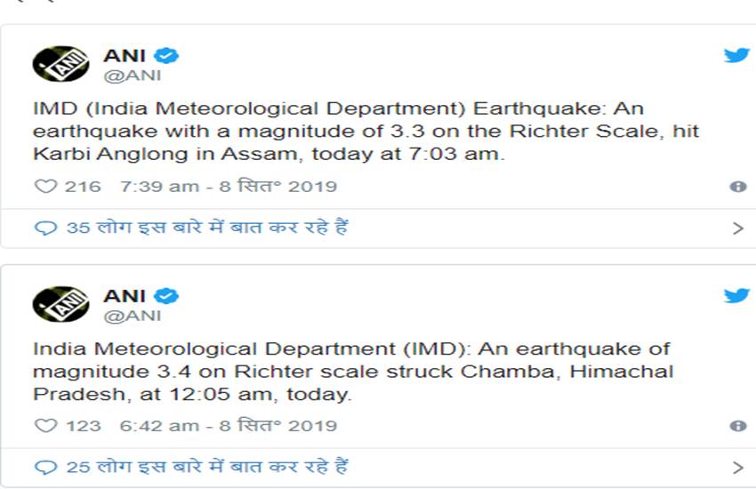 असम में भी महसूस किए गए झटकेः असम के कार्बी आंगलोग में आज सुबह 7 बजकर 3 मिनट पर भूकंप आया है। मौसम विभाग द्वारा इस बात की जानकारी दी गई। भूकंप के झटके महसूस होने के बाद लोग अपने घरों से बाहर निकलकर सुरक्षित स्थानों पर पहुंचे। जानकारी के मुताबिक भूकंप की गति बहुत कम थी, लेकिन अधिक प्रभावित करने वाली नहीं थी। इससे पहले महाराष्ट्र के पालघर जिले में एक के बाद एक 4 बार भूकंप आने के बाद एक मकान के ढह जाने से एक व्यक्ति की मौत हो गई थी।