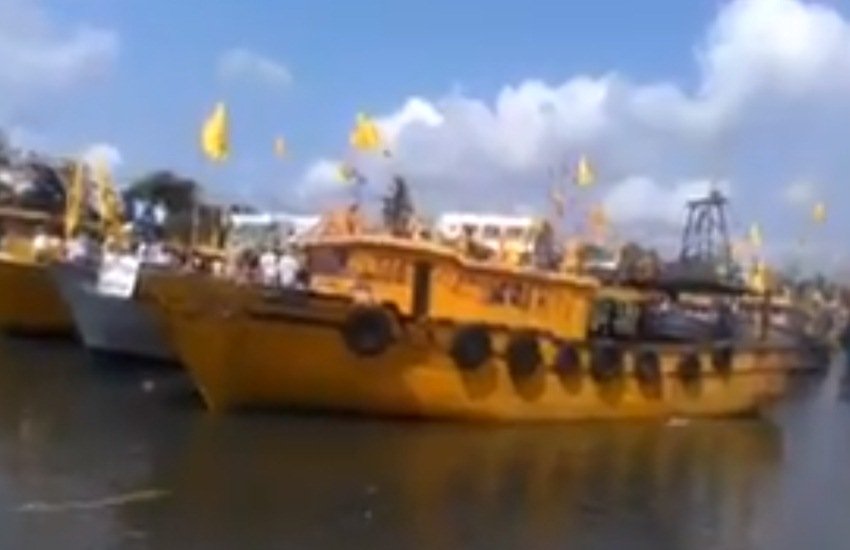 आंध्र प्रदेश को विशेष राज्य का दर्जा देने की मांग को लेकर जारी विरोध प्रदर्शन थमने का नाम नहीं ले रहा है। संसद का बजट सत्र समाप्त होने के बाद तेलुगु देशम पार्टी (टीडीपी) के कार्यकर्ता आंध्र प्रदेश में ही प्रदर्शन कर रहे हैँ। उनके विरोध प्रदर्शन से आमलोगों को दिक्कत न हो इसके लिए विरोध जताने का नया तरीका ईजाद किया गया है। टीडीपी के नेता और कार्यकर्ताओं ने सड़क के बजाय नदी में मछली पकड़ने वाले नावों के जरिये प्रदर्शन किया। यह तरीका पार्टी की काकीनाड़ा इकाई ने अपनाया। मीडिया रिपोर्ट के अनुसार, काकीनाड़ा नगर के विधायक वनमाड़ी वेंकेटेश्वर राव ने सभी नावों को मंगलवार (17 अप्रैल) को झंडा दिखाकर रवाना किया था। पार्टी कार्यकर्ता नावों से बंगाल की खाड़ी में स्थित होप आईलैंड तक गए थे। वहां से सभी प्रदर्शनकारी दोपहर बाद तक काकनाड़ा वापस लौट आए थे।