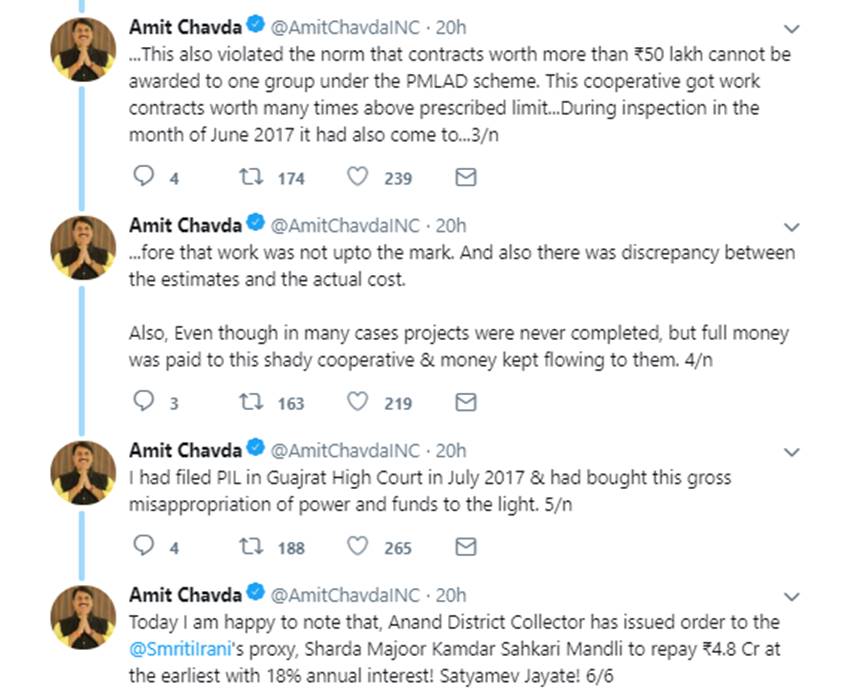 चावड़ा ने एक ट्वीट में बताया- ”मैंने गुजरात हाईकोर्ट में 2017 में एक जनहित याचिका दायर की थी और शक्ति और धन के भारी दुरुपयोग को प्रकाश में लाया था।” एक और ट्वीट में चावड़ा ने लिखा- ”आज मैं यह देखकर खुश हूं कि आणंद के जिला कलेक्टर ने स्मृति ईरानी के प्रतिनिधि, शारदा मजूर कामदार सहकारी मंडली तो 18 फीसदी सालाना ब्याज के साथ 4.8 करोड़ रुपये लौटाने का आदेश दिया है।”