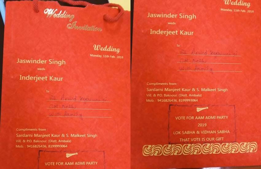 शादी करने जा रहे हरियाणा के एक जोड़े ने विवाह में आने वाले मेहमानों से एक अनोखा उपहार मांगा है। जोड़े ने मेहमानों से उन्हें आशीर्वाद के रूप में अरविंद केजरीवाल के नेतृत्व वाली आम आदमी पार्टी (AAP) को वोट देने अपील की है। दरअसल AAP के सोशल मीडिया रणनीतिज्ञ अंकित लाल ने सोशल मीडिया प्लेटफॉर्म पर जसविंदर कौर और इंद्रजीत कौर का शादी कार्ड शेयर किया है। इस कार्ड के जरिए जोड़े ने 2019 के लोकसभा और विधानसभा चुनाव में आम आदमी पार्टी को वोट देने की अपील की है। कार्ड में लिखा गया, ‘2019 के लोकसभा और विधानसभा चुनाव में AAP को वोट करें। यह वोट ही हमारा गिफ्ट होगा।’