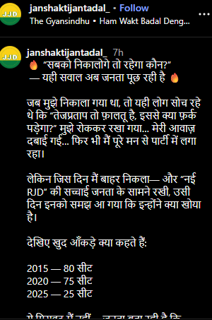 जनशक्ति जनता दल के इंस्टाग्राम हैंडल के माध्यम से पोस्ट किए गए एक मैसेज में तेज प्रताप यादव ने कहा, “सब को निकालोगे तो रहेगा कौन? यही सवाल अब जनता पूछ रही है। जब मुझे निकाला गया था, तो यही लोग सोच रहे थे कि तेजप्रताप तो फालतू है, इससे क्या फर्क पड़ेगा। मुझे रोककर रखा गया। मेरी आवाज दबाई गई। फिर भी मैं पूरे मन से पार्टी में लगा रहा। लेकिन जिस दिन मैं बाहर निकला और नई RJD की सच्चाई जनता के सामने रखी, उसी दिन इनको समझ आ गया कि इन्होंने क्या खोया है।