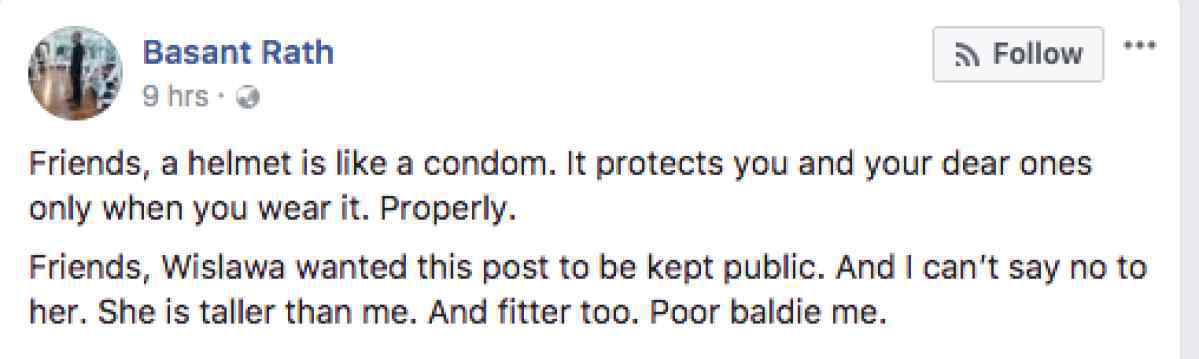 आपको बता दें कि इससे पहले भी आईजी ट्रैफिक का पद संभालने के तुरंत बाद बसंत रथ ने तेज-तर्रार अंदाज में एक चेतावनी जारी की थी। फेसबुक पर जारी चेतावनी में हेलमेट की तुलना कंडोम से करते हुए दुर्घटना से बचने के लिए आम लोगों खास कर पुलिस अधिकारियों और बाइक सवारों से इसे पहनने का अनुरोध किया गया था।