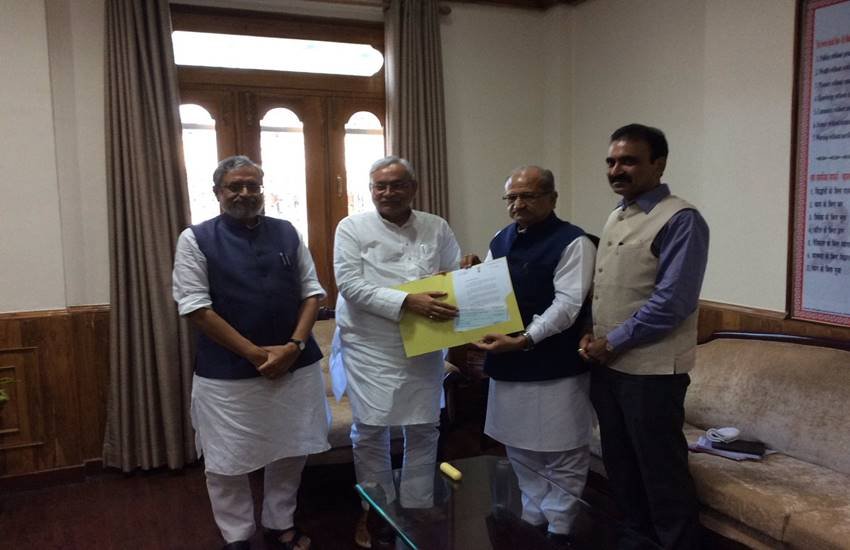 Gujarat Rev&Edu Min @BhupendraSinh1 handing over a cheque of Rs 5 crore to Bihar CM @NitishKumar & deputy CM @SushilModi 2ward flood relief. pic.twitter.com/ObocCYF88D