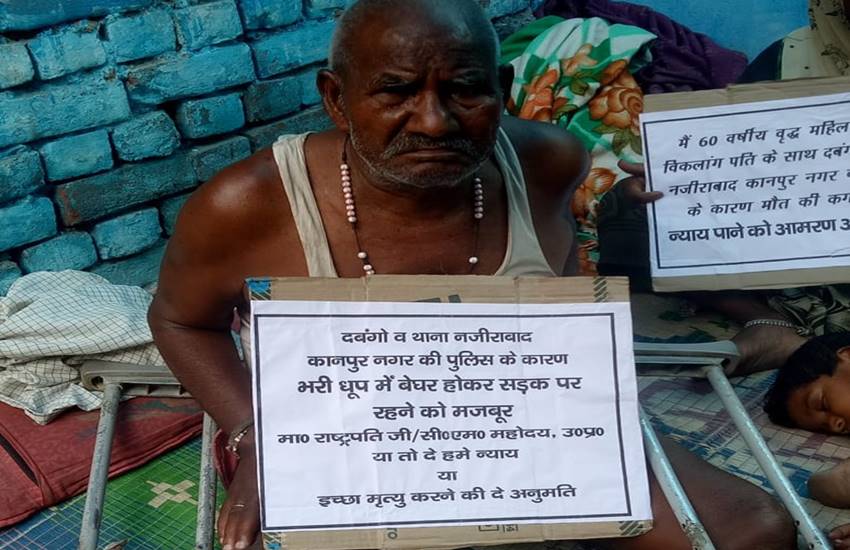 उत्तर प्रदेश के कानपुर जनपद में दिव्यांग चाचा के मकान पर भतीजे ने कब्जा कर उन्हें बेघर कर दिया। न्याय न मिलने पर तीन दिन से घर के बाहर बैठे दिव्यांग दम्पति ने अनशन करते हुए राष्ट्रपति से इच्छा मृत्यु की मांग की है। इच्छा मृत्यु मांगने वाले दम्पति ने पुलिस पर भी गंभीर आरोप लगाये हैं। मिली जानकारी के अनुसार नजीराबाद थानाक्षेत्र के सरोजनी नगर इलाके में स्थित कबाड़ी मार्केट में रहने वाले शिवराम (80) दिव्यांग है। उनकी पत्नी श्यामादेवी (75) भी दिव्यांग हैं।
