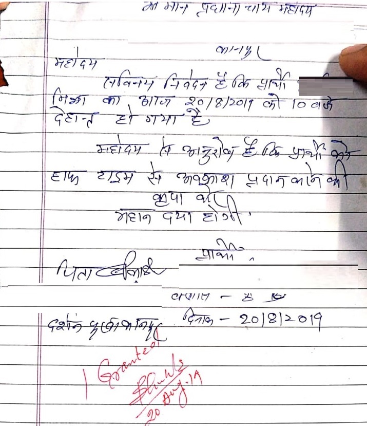 ये है छात्र के आवेदन पत्र मेंः छात्र ने लिखा है, ‘महोदय, सविनय निवेदन है कि प्रार्थी (छात्र का नाम) का आज 20 अगस्त 2019 को 10 बजे देहांत हो गया है। महोदय से अनुरोध है कि प्रार्थी को हाफ टाइम से अवकाश प्रदान करने की कृपा करे। महान दया होगी।’ हालांकि इस बात की पुष्टि नहीं हो पाई है कि यह पत्र छात्र ने ही लिखा है।