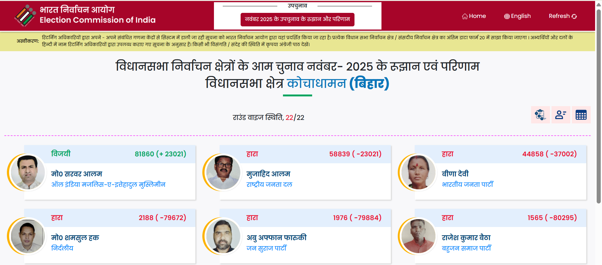 Kochadhaman Assembly Election Result 2025: बिहार विधानसभा चुनाव के मतगणना में कोचाधामन सीट (Kochadhaman Election Result 2025) पर एआईएमआईएम (AIMIM) के उम्मीदवार सरवर आलम ने 23021 वोटों के अंतर से जीत दर्ज कर ली है। उन्होंने इस सीट पर राष्ट्रीय जनता दल के मुजाहिद आलम को हराया है।