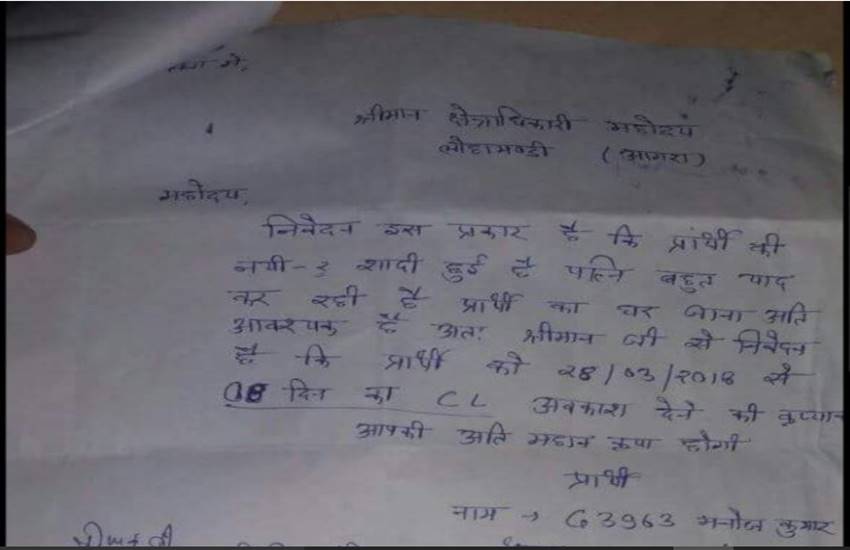 ‘पत्नी बहुत याद कर रही है, छुट्टी दे दिजिए’,। यह गुजारिश है यूपी पुलिस के एक जवान की अपने अफसरों से। यूपी पुलिस का यह जवान आगरा जिले में तैनात है और उसे करीब आठ दिनों की छु्ट्टी की निहायत ही आवश्यकता है। इस जवान ने अपने अफसरों को अपनी छुट्टी के लिए जो एप्लिकेशन दी है उसे पढ़कर एक बात तो आप की भी हंसी छूट जाएगी। आगरा में तैनात इस सिपाही का नाम मनोज है। छुट्टी के लिए अफसरों की भेजी गई उसकी अर्जी सोशल मीडिया पर खूब वायरल हो रही है।