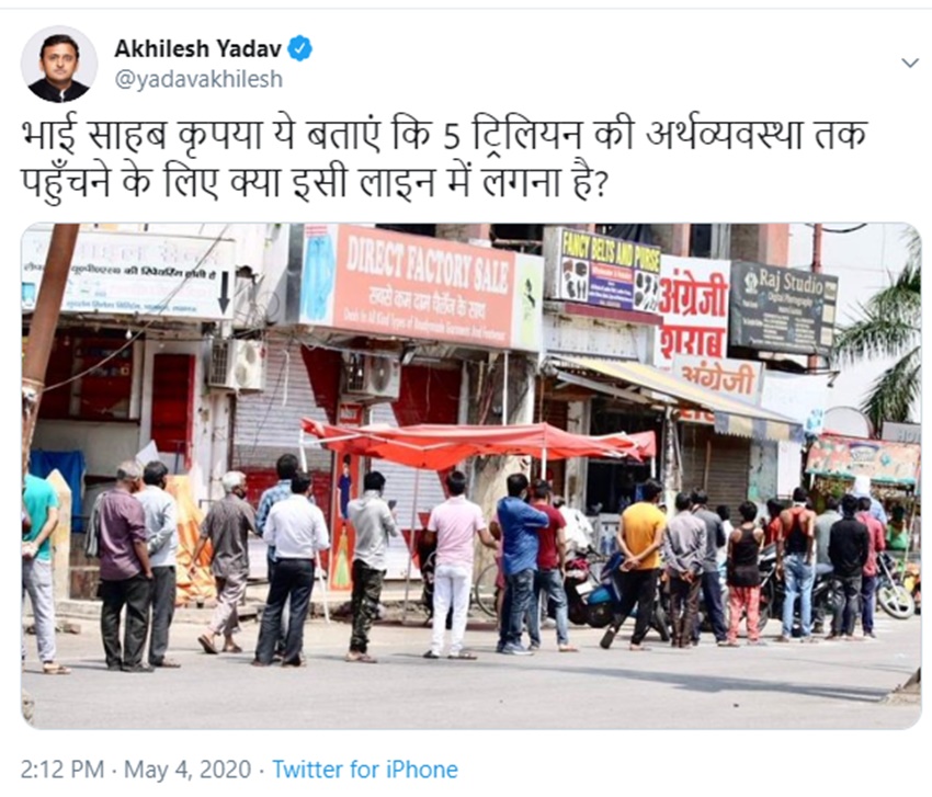 Lockdown 3.0: देशभर में आज यानी चार मई से लॉकडाउन के तीसरे चरण की शुरुआत में केंद्र द्वारा शराब की दुकानें खोलने की अनुमति दिए जाने पर उत्तर प्रदेश के पूर्व मुख्यमंत्री अखिलेश यादव ने सरकार पर निशाना साधा है। सपा नेता ने सोमवार (4 मई, 2020) को एक ट्वीट के जरिए कहा कि ‘भाई साहब कृपया ये बताएं कि 5 ट्रिलियन की अर्थव्यवस्था तक पहुंचने के लिए क्या इसी लाइन में लगना है?’ ट्वीट के साथ उन्होंने एक तस्वीर भी शेयर की है, जिसमें लोग शराब की दुकान खुलने से पहले ही लंबी-लंबी लाइनें लगाकर खड़े हो गए। तस्वीर में कोई सोशल डिस्टेंसिंग का पालन करते हुए भी नजर नहीं आ रहा।