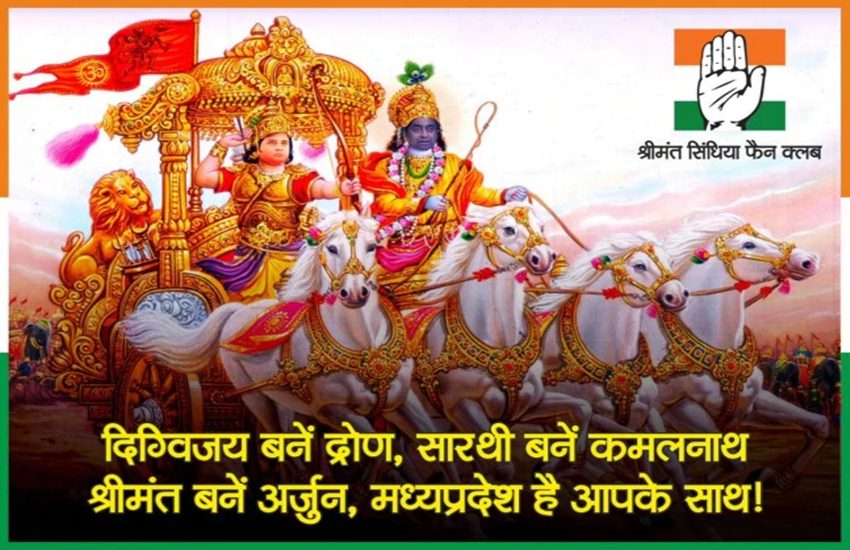 एक अन्य पोस्ट में सिंधिया को रथ पर सवार अर्जुन की भूमिका में दिखाया गया है। इसमें कमलनाथ उनके सारथी बने हुए हैं और लिखा है, “दिग्विजय बनें द्रोण, सारथी बनें कमलनाथ, श्रीमंत बनें अर्जुन, मध्य प्रदेश है आपके साथ।”