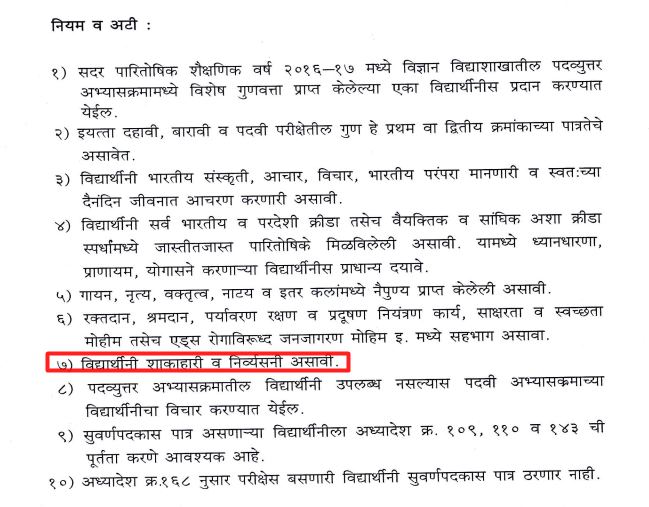 पुणे विश्वविद्यालय ने शुक्रवार को एक अजीबोगरीब आदेश जारी किया है। इस आदेश के मुताबिक विश्वविद्यालय के मांसाहारी छात्र पढ़ने-लिखने में काबिल होने के बावजूद गोल्ड मेडल पाने के हकदार नहीं होंगे। यूनिवर्सिटी प्रशासन के मुताबिक गोल्ड मेडल पाने की कई शर्तों में एक शर्त छात्र-छात्रा का शाकाहारी होना भी शामिल है। पूणे यूनिवर्सिटी भारत की नामी-गिरामी शिक्षण संस्थाओं में से एक है। यूनिवर्सिटी की स्थापना साल 1949 में की गई। साल 2014 के अगस्त महीने में महाराष्ट्र सरकार ने इस विश्वविद्यालय का नाम राज्य की महान समाज सुधारक और शिक्षा के क्षेत्र में अग्रणी काम करने वाली सावित्रीबाई फुले के नाम पर रख दिया गया। इसके बाद यह यूनिवर्सिटी सावित्रीबाई फुले पुणे यूनिवर्सिटी के नाम से जाना जाने लगा। विश्वविद्यालय प्रशासन ने त्यागमूर्ति श्रीमती सरस्वती रामचन्द्र शेलार स्वर्णपदक देने की घोषणा की है।