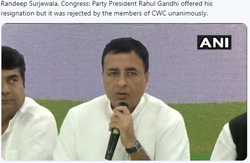कांग्रेस प्रवक्ता रणदीप सुरजेवाला ने कहा कि कांग्रेस अध्यक्ष राहुल गांधी ने CWC की मीटिंग में अपने इस्तीफे की पेशकश की थी। लेकिन सभी सदस्यों ने इसे मानने से इंकार कर दिया है।