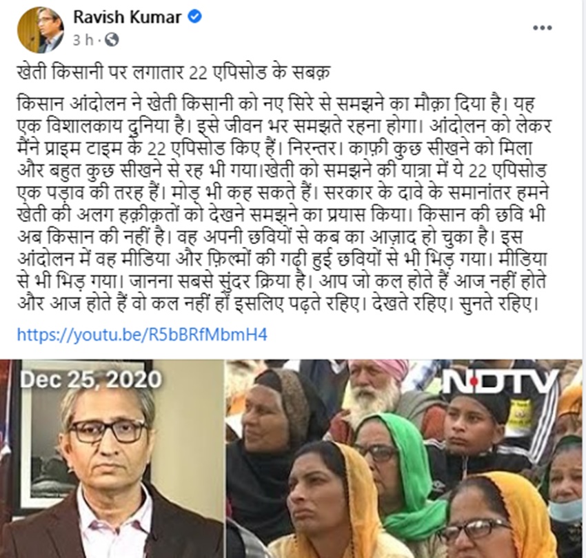 एनडीटीवी पर प्राइम टाइम शो के एंकर रवीश कुमार ने लिखा कि खेती किसानी पर लगातार 22 एपिसोड से उन्हें कई सबक मिले। पोस्ट के मुताबिक किसान आंदोलन ने खेती किसानी को नए सिरे से समझने का मौका दिया है। यह एक विशालकाय दुनिया है। इसे जीवन भर समझते रहना होगा। आंदोलन को लेकर मैंने प्राइम टाइम के 22 एपिसोड किए हैं। निरन्तर। काफी कुछ सीखने को मिला और बहुत कुछ सीखने से रह भी गया। खेती को समझने की यात्रा में ये 22 एपिसोड एक पड़ाव की तरह हैं। मोड़ भी कह सकते हैं।