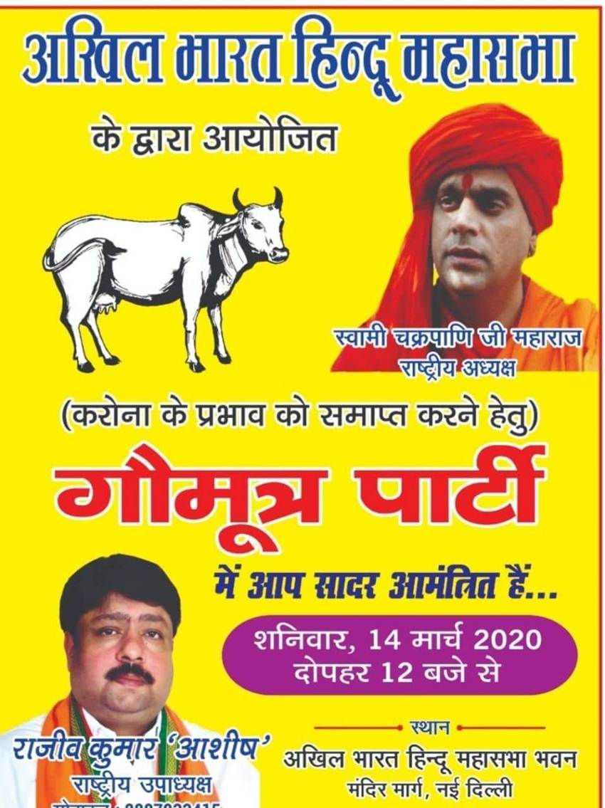 महासभा के इन पोस्टरों में लिखा है, “अखिल भारतीय हिंदू महासभा द्वारा आयोजित गोमूत्र पार्टी में आप सभी सादर आमंत्रित हैं। यह कार्यक्रम शनिवार 14 मार्च दोपहर 12 बजे से नई दिल्ली में मंदिर मार्ग स्थित अखिल भारत हिंदू महासभा भवन में होगा। यह कार्यक्रम कोरोना वायरस के प्रभाव को समाप्त करने के लिए कराया जा रहा है।”