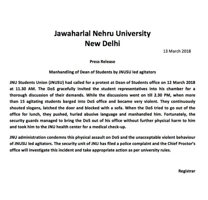 डीन के साथ इस बदसलूकी के मसले पर बाद में जेएनयू ने लिखित में बयान भी जारी किया था। कहा था, “12 मार्च को सुबह साढ़े 11 बजे डीन के चैंबर के बाहर जेएनयू छात्र संघ (जेएनयूएसयू) ने विरोध प्रदर्शन किया था। डीन ने इसी को लेकर उन्हें बातचीत के लिए बुलाया था। दोपहर ढाई बजे तो बातचीत हुई, तभी 15 से अधिक प्रदर्शनकारी छात्र अंदर घुस आए और वे हिंसक हो गए। वे जोर-जोर से नारेबाजी कर रहे थे। दरवाजे के बीच सोफ फंसा दिया था।”