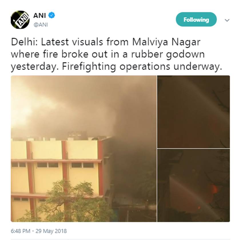 नई दिल्ली के मालवीय नगर में मंगलवार (29 मई) शाम रबड़ के गोदाम में लगी भयंकर पर काबू पा लिया गया है। भीषण आग पर तकरीबन 17 घंटों बाद काबू पाया जा सका। भारतीय वायु सेना के चॉपर और दिल्ली अग्निशमन सेवा की 90 गाड़ियों की मदद से यह रेस्क्यू ऑपरेशन पूरा हुआ। गोदाम के आस-पास इससे पहले रबड़ धू-धू कर जल रही थी। आलम यह था कि धुएं के कारण घटनास्थल के नजदीक कुछ भी नजर नहीं आ रहा था।