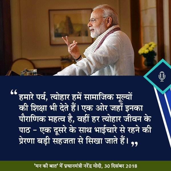 प्रधानमंत्री ने कहा कि मैं आप सभी को 2019 की बहुत-बहुत शुभकामनाएं देता हूं और आने वाले त्योहारों का आप भरपूर आनन्द उठाएं इसकी कामना करता हूं। इन उत्सवों पर ली गई photos को सबके साथ share करें ताकि भारत की विविधता और भारतीय संस्कृति की सुन्दरता को हर कोई देख सके।